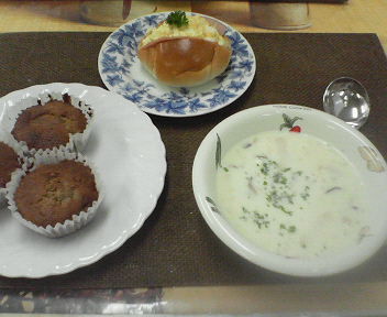 茸のポタージュ・りんごとクルミのカップケーキです。