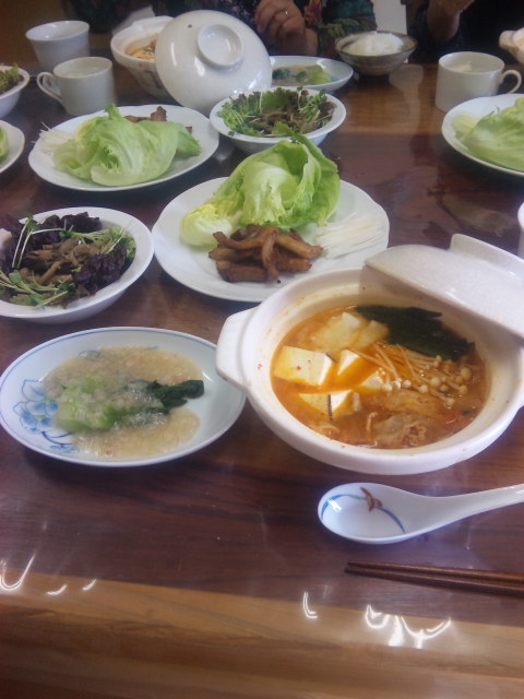 茸の中華風あえもの、青梗菜のカニあんかけ、揚げ肉のレタス包み、キムチ鍋(もち入り)、白玉団子杏仁風味