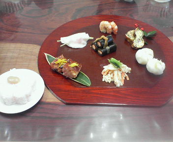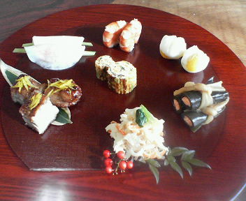 かぶとスモークサーモン・胡麻なます・千種焼卵・鶏もも肉の照り焼き柚子風味・海老の生姜煮・鮭の昆布巻き・山芋きんとん