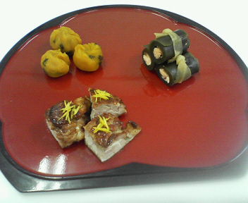 鮭の昆布巻き・鶏もも肉の照り焼き柚子風味・かぼちゃのきんとん